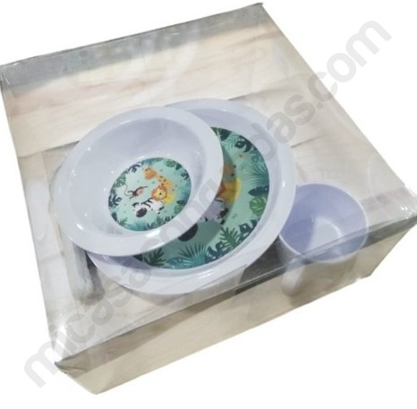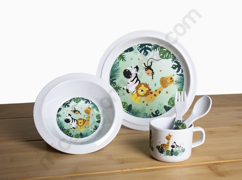 Bonica vaixella infantil SAFARI, il·lustrada amb simpàtics animals de la Sabana Africana, que faran somiar i imaginar aventures als petits de la casa, a l'hora de seure a taula.
